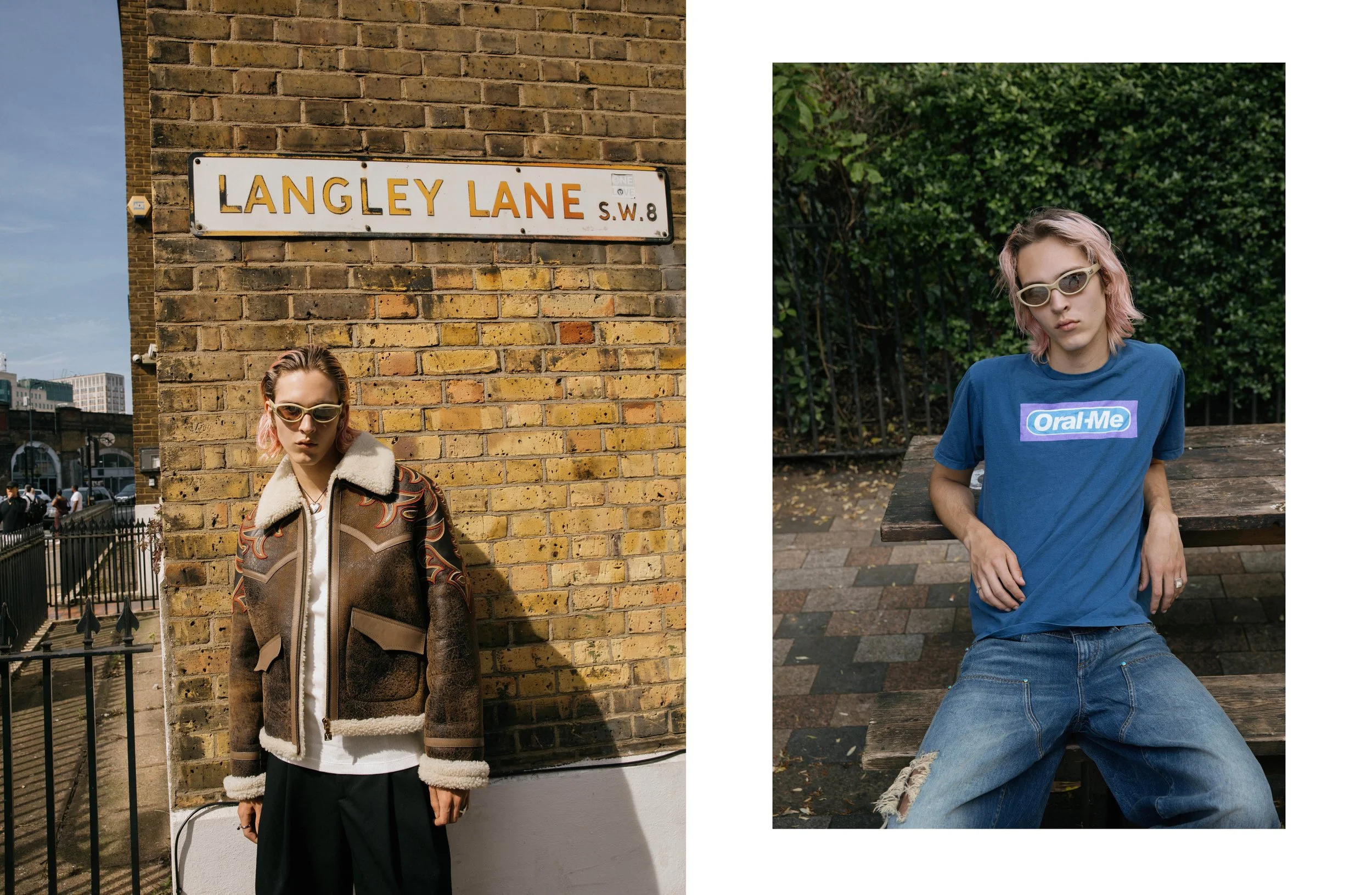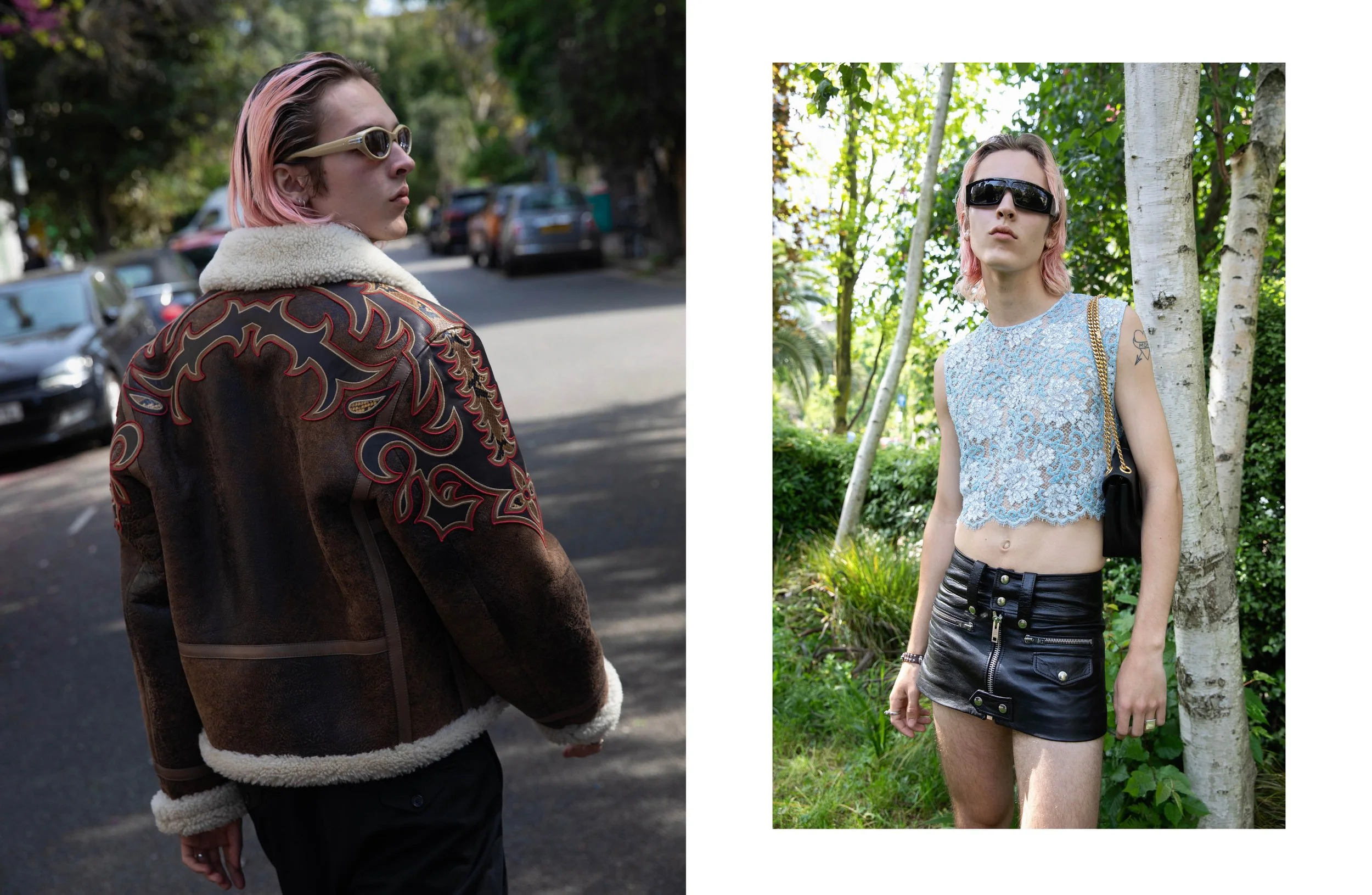 Right Jacket, pants and shoes Wales Bonner, T-shirt Louis Vuitton, belt Celine Homme, sunglasses Gentle Monster, jewellery model’s own